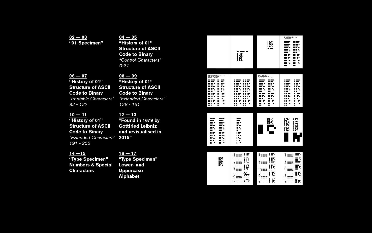 Scanning through typography. A research on reading methods of text and experimenting with linear and binary systems. This was presented at MOTI, Museum of the Image in Breda, as part of the exhibiton Design my Privacy. It shows a type specimen originated from binary code showing possible graphic patterns.